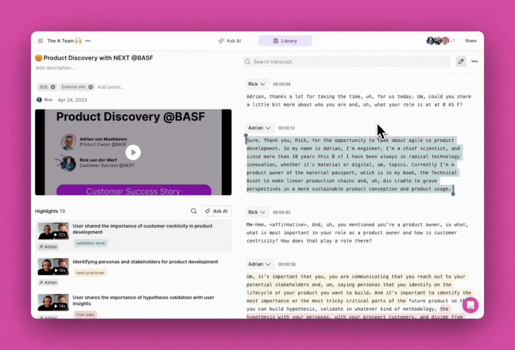 NEXT lets you bring all your product discovery data into NEXT in its rawest form; audio or video recordings from customer interactions, text data from surveys or support tickets and more. This "raw data" goes into the "Recordings Library" in NEXT.